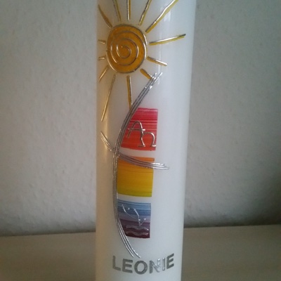 Für diesen Anlass bietet sich aber auch eine selbstgestaltete neue Kommunionkerze an, gerne kann ich selbstgemalte Bilder oder ein Foto von Ihrem Kind mit einarbeiten.
